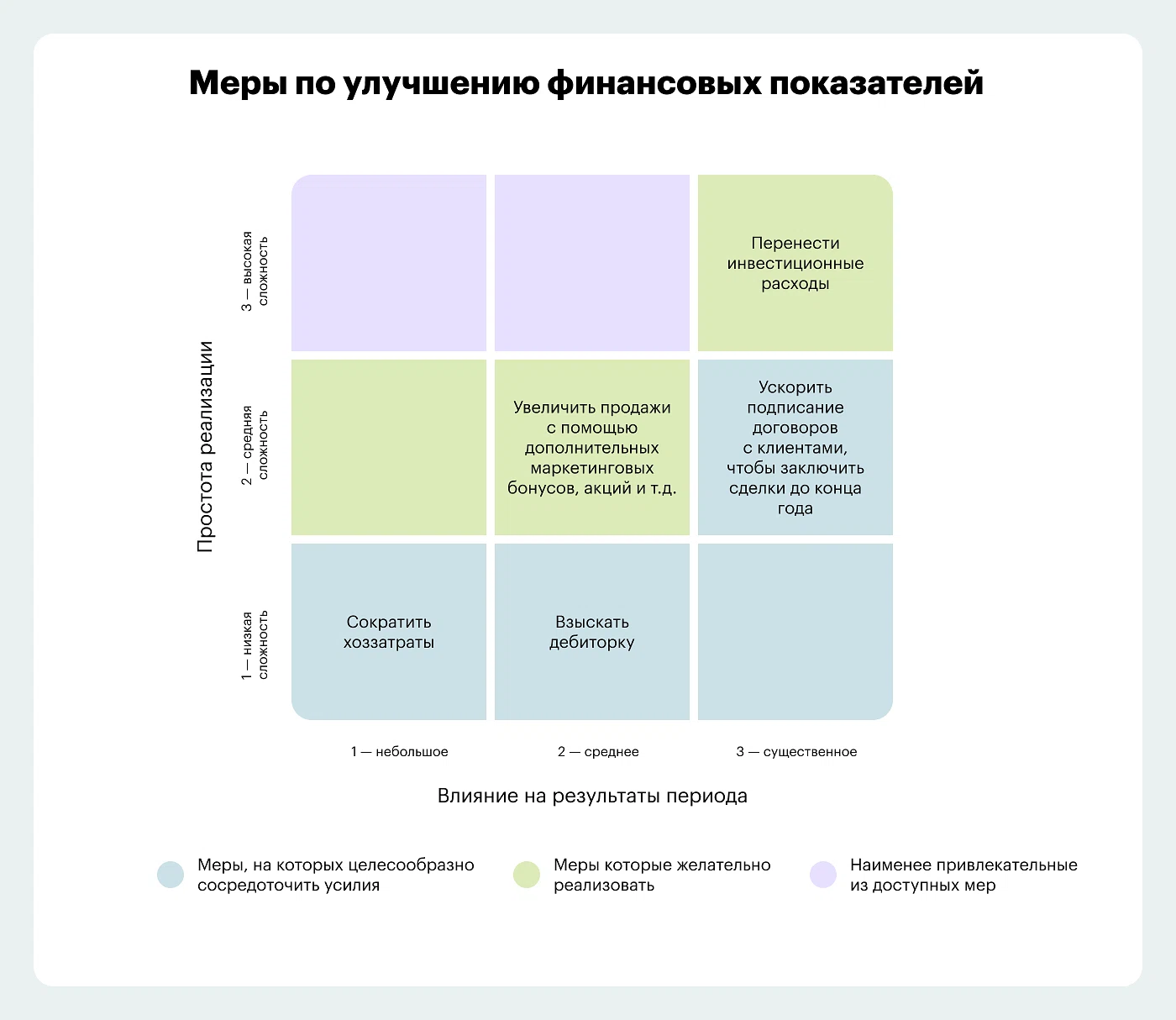 На основании анализа формируется стратегия снижения издержек и повышения отдачи инвестиций. В плане обязательно прописываются принятые меры, ответственные за реализацию и сроки исполнения.